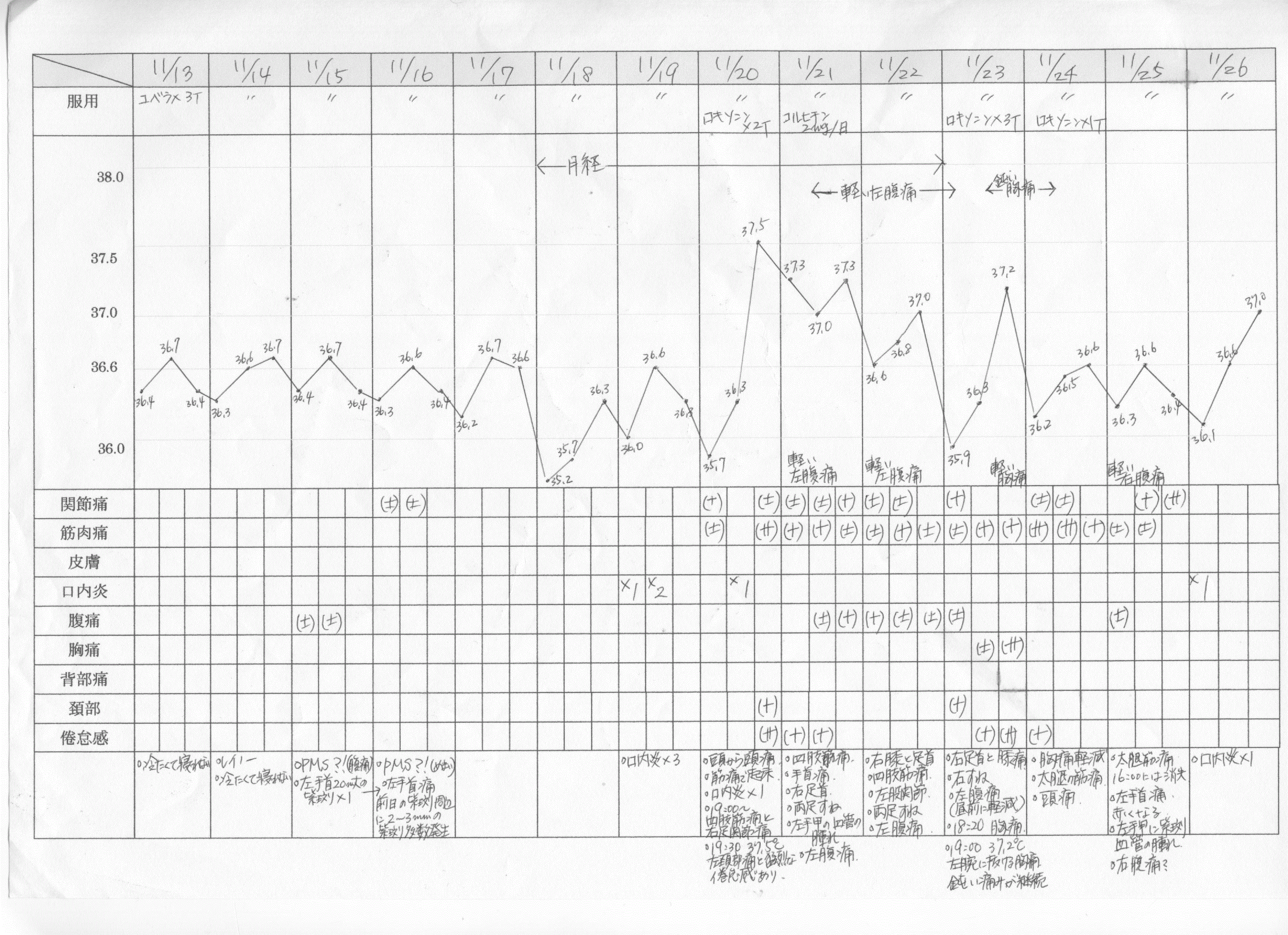 自己炎症疾患は症状も経過も個人差が大きく、人によっては出る症状・出ない症状があるので頻繁に起きる症状、自分にとって重要と思われる症状の項目を選んで記録してください。